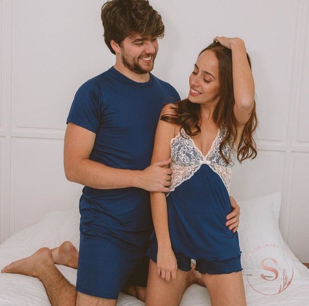 Pijama Fernando confeccionado em tecido leve. Composto por duas peças, sendo uma camiseta de modelagem reta com gola arredondada e mangas curtas, e shorts curto com elasticidade no cós.